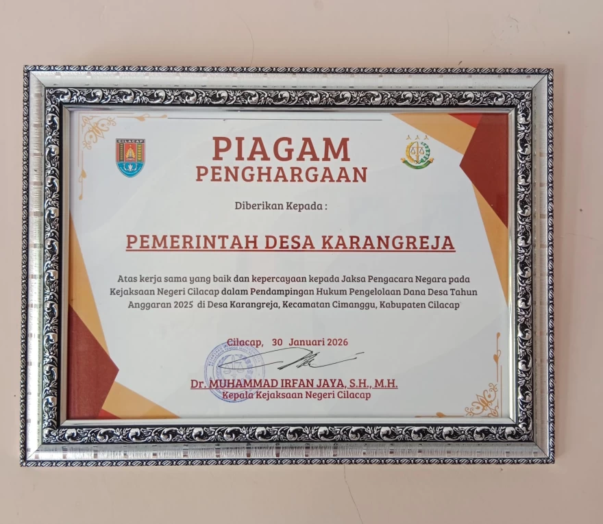 Kejaksaan Negeri Cilacap memberikan apresiasi dan piagam penghargaan kepada Pemerintah Desa Karangreja, Kecamatan Cimanggu, atas kerja sama dan komitmen dalam pelaksanaan pendampingan hukum terhadap kegiatan pengelolaan Dana Desa Tahun Anggaran 2025. Pemberian piagam penghargaan tersebut merupakan bentuk pengakuan atas upaya Pemerintah Desa Karangreja dalam mewujudkan tata kelola keuangan desa yang transparan, akuntabel, dan sesuai dengan ketentuan peraturan perundang-undangan.